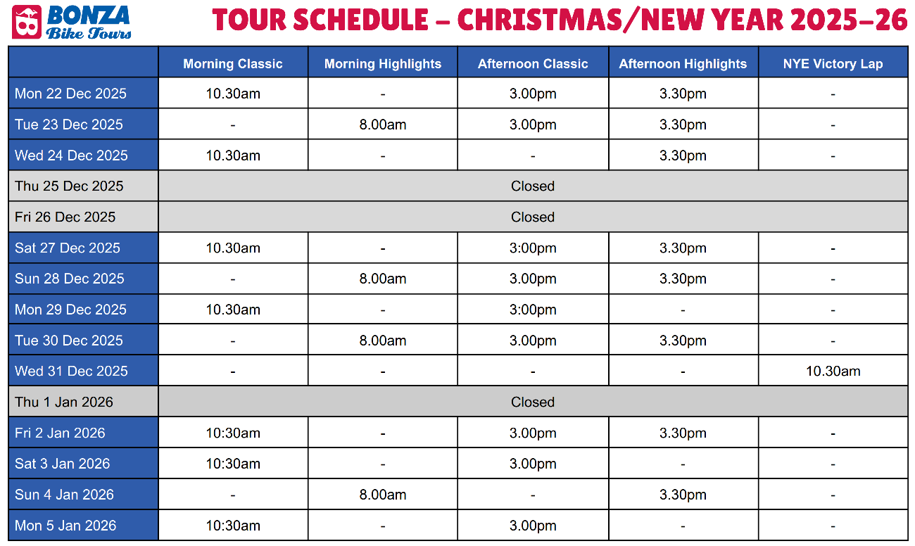 During the festive season in Sydney, it is very busy, especially around Circular Quay and Darling Harbour where many locals and travellers gather to celebrate and enjoy Sydney’s iconic sights. We kindly ask for your patience and understanding whilst our experienced guides navigate the busy areas to ensure the smoothest and safest ride possible.